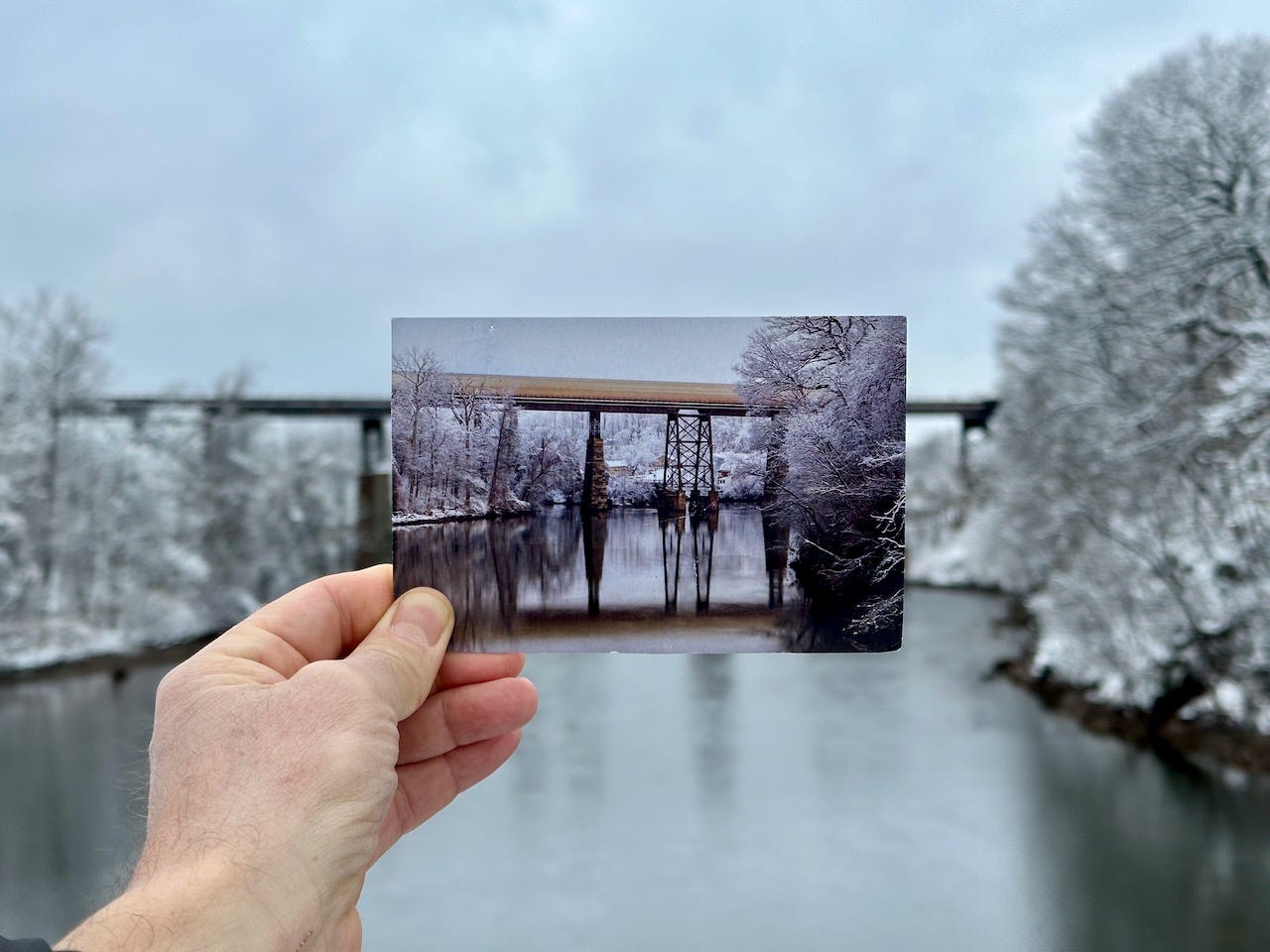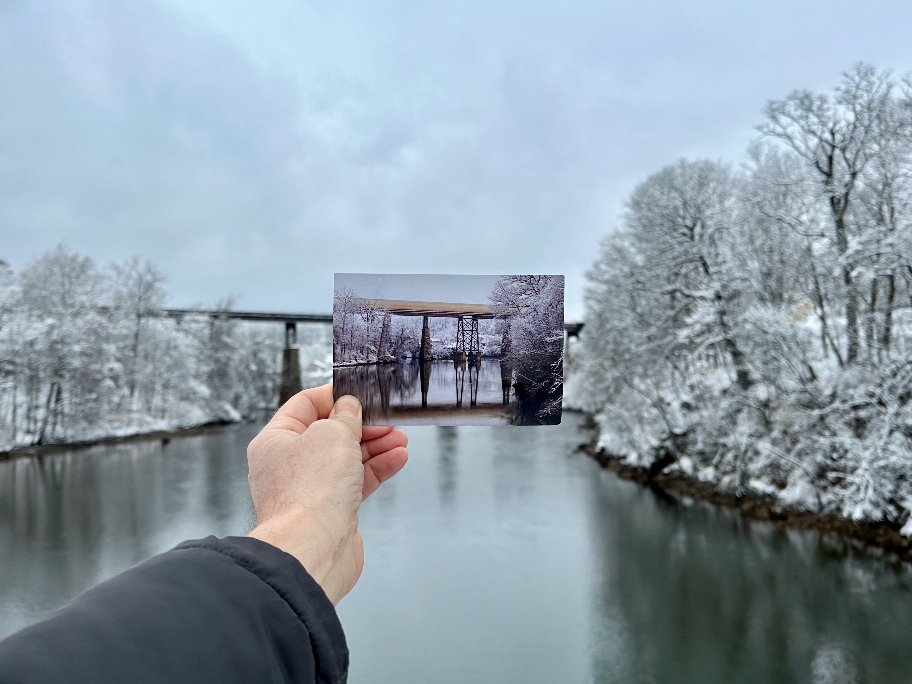 With no train in sight I had time to play around with the postcard and the view in front of me. Taking my gloves off, I held the postcard out towards the bridge, matched the location of the train in the postcard to the bridge and took the photo below on my iPhone.